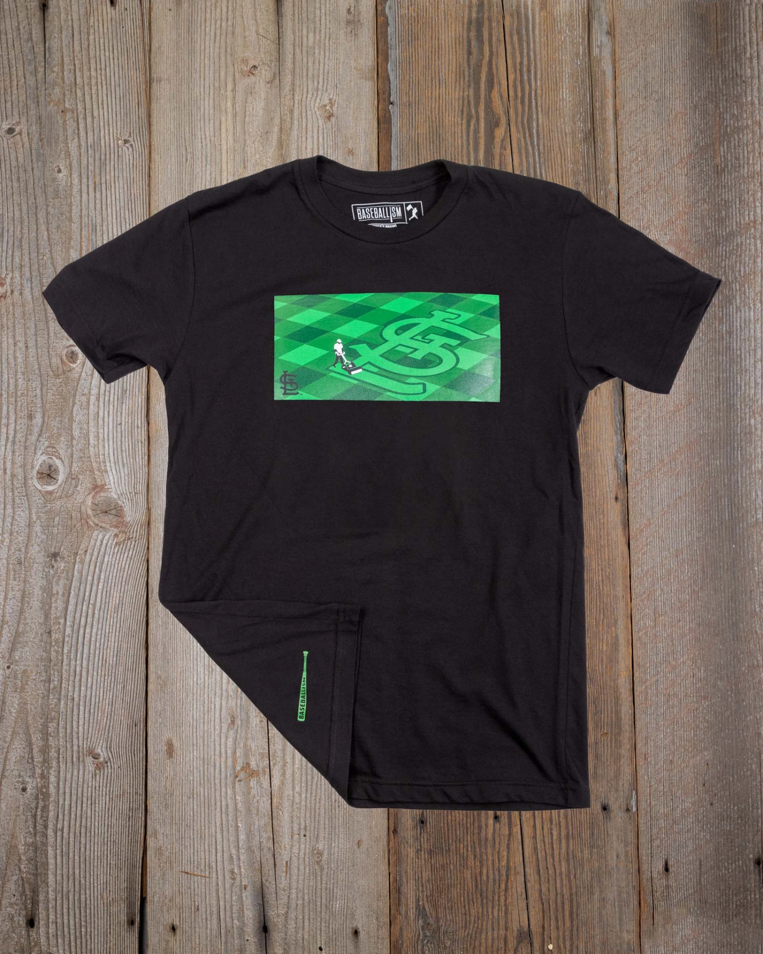 – Vintage Baseballism bat screened on back right of the garment