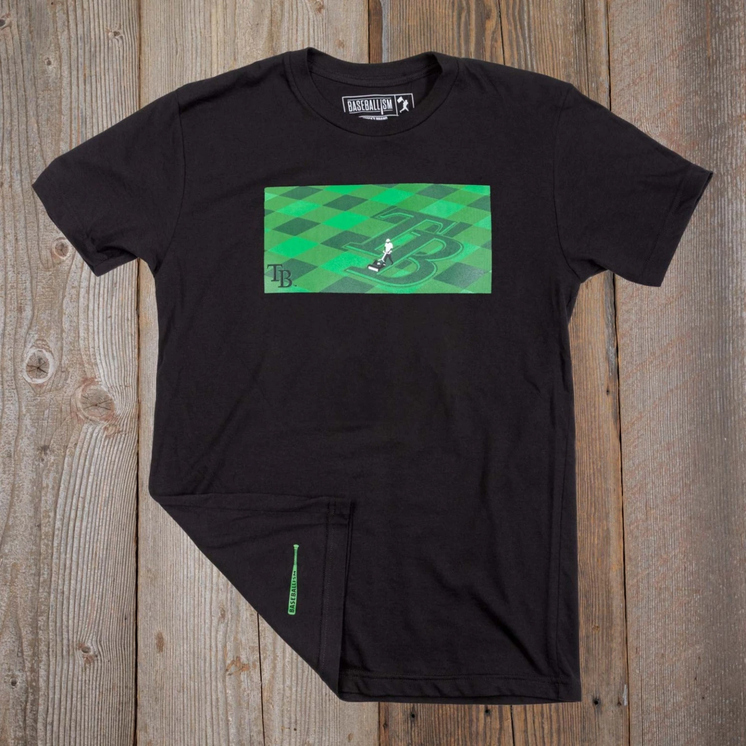 – Vintage Baseballism bat screened on back right of the garment