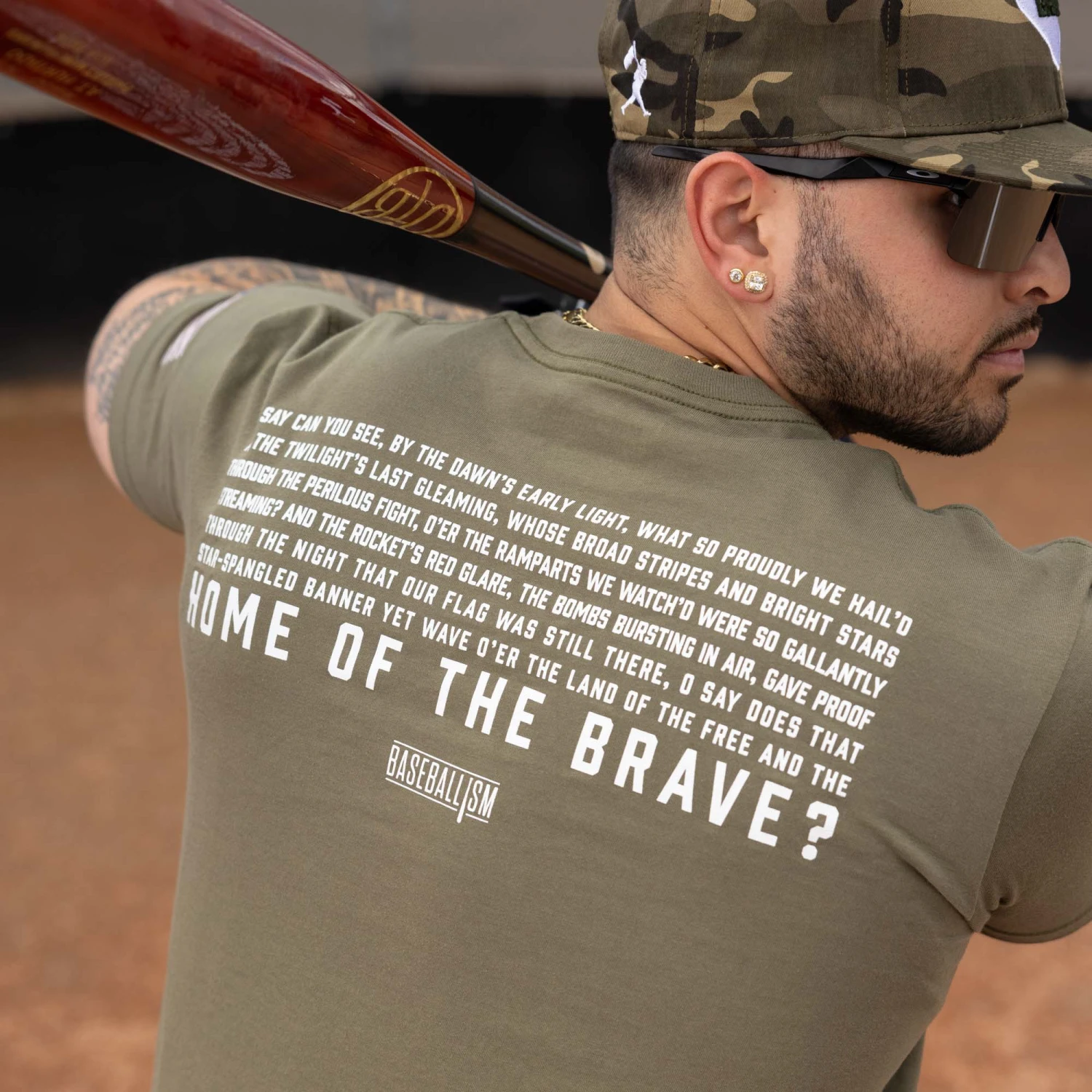 The original words to our National Anthem are screened on the back of this must have patriotic baseball tee.
